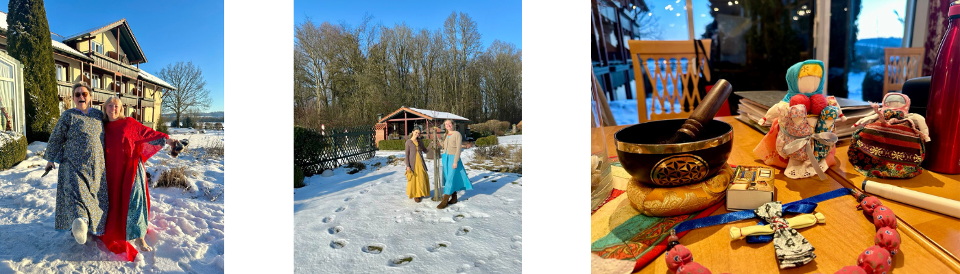 Gerade der Januar erwies sich als eine besonders stimmige Zeit für diese Arbeit. Während die Natur draußen im Rückzug war, die Tage stiller und langsamer wurden, entstand im Hotel ein geschützter Raum der Einkehr. In einem Kreis von Frauen wurde eine uralte handwerkliche Tätigkeit wieder lebendig – das Nähen mit den Händen, im eigenen Rhythmus, verbunden mit innerer Präsenz. Der Winter lud ein, nach innen zu lauschen, Altes zu ordnen und Neues leise entstehen zu lassen – genau so, wie es beim Nähen eines sakralen Kleides geschieht.